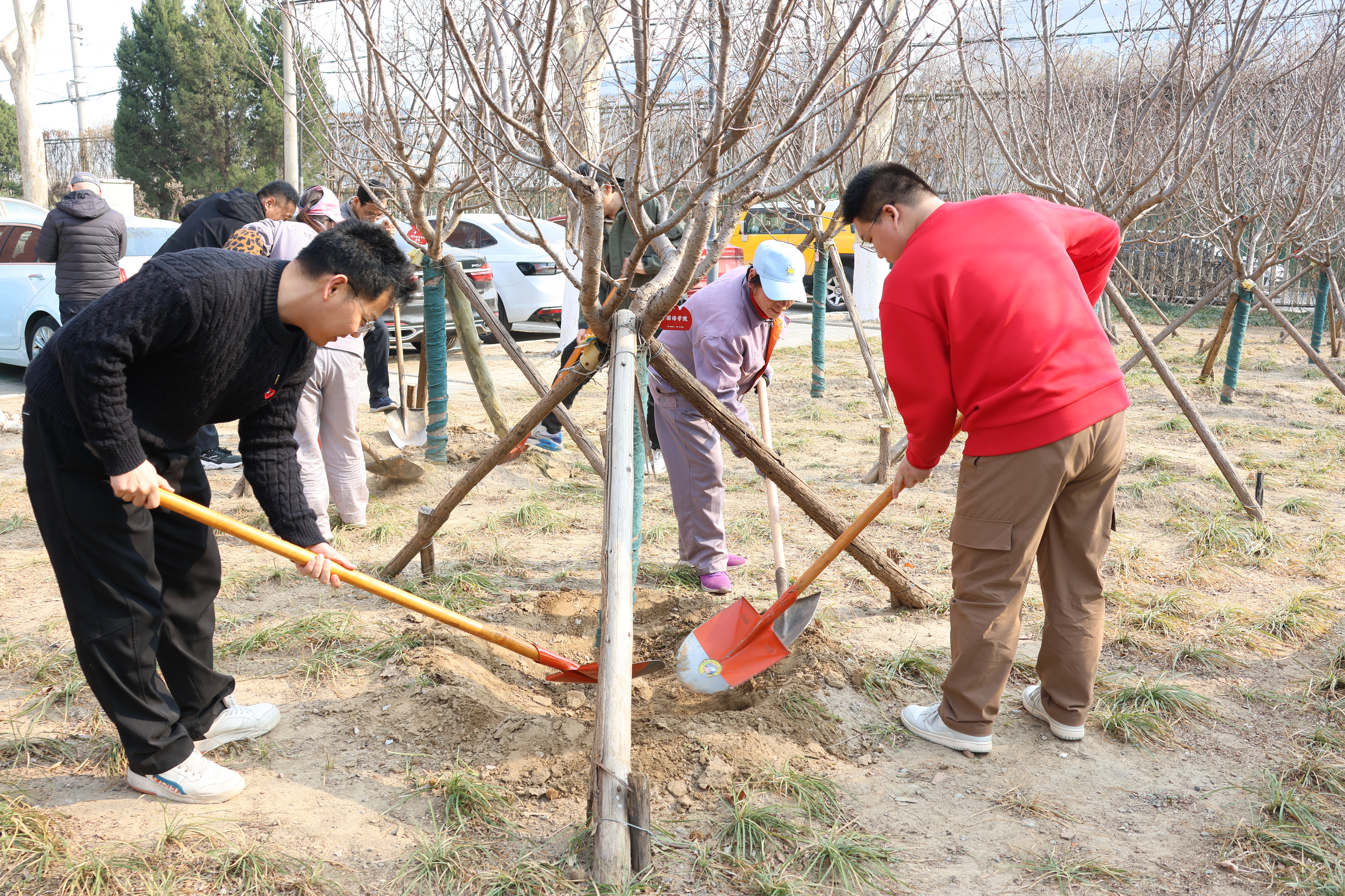 活动中,党员、团员们拿起铁锹,俯身于校园树木周围,对树坑内的杂草落叶进行细致清理,对树根周边的土壤进行松土培实。一锹一铲之间,原本板结的土地变得松软平整,一道道规整的土埂为后续浇灌积蓄养分。区域内树木树埂得到修整完善,为后续灌溉蓄水、促进树木生长创造了良好条件,也为春日校园增添了生机。